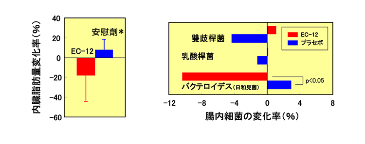 | 以10位40-50歲BMI (身高體重比例) 超過25的健康男性進行測試。 連續12星期,5人每人每天食用200mg EC-12乳酸球菌。 連續12星期,5人每人每天食用200mg 安慰劑。 |