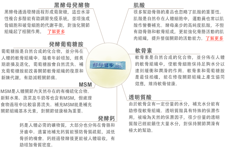 | 酵母楽步包含的黑酵母發酵物、高純度肌酸、葡萄糖胺、軟骨素、MSM、透明質酸及發酵鈣,能有助修復軟骨組織,增強關節肌肉,鎖住水分穩定骨膠原,並強化骨質密度,對紓緩關節痛及保持骨質健康有一定成效。 | ||||||||||||